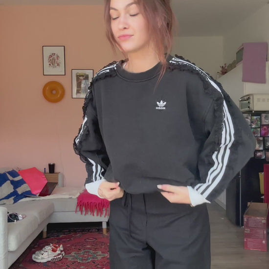 Deze tweedehands Adidas sweater is een nieuw leven in geblazen.Met de nieuwe boords heeft hij weer een frisse look gekregen. Afgemaakt met kant en een paar strassjes.