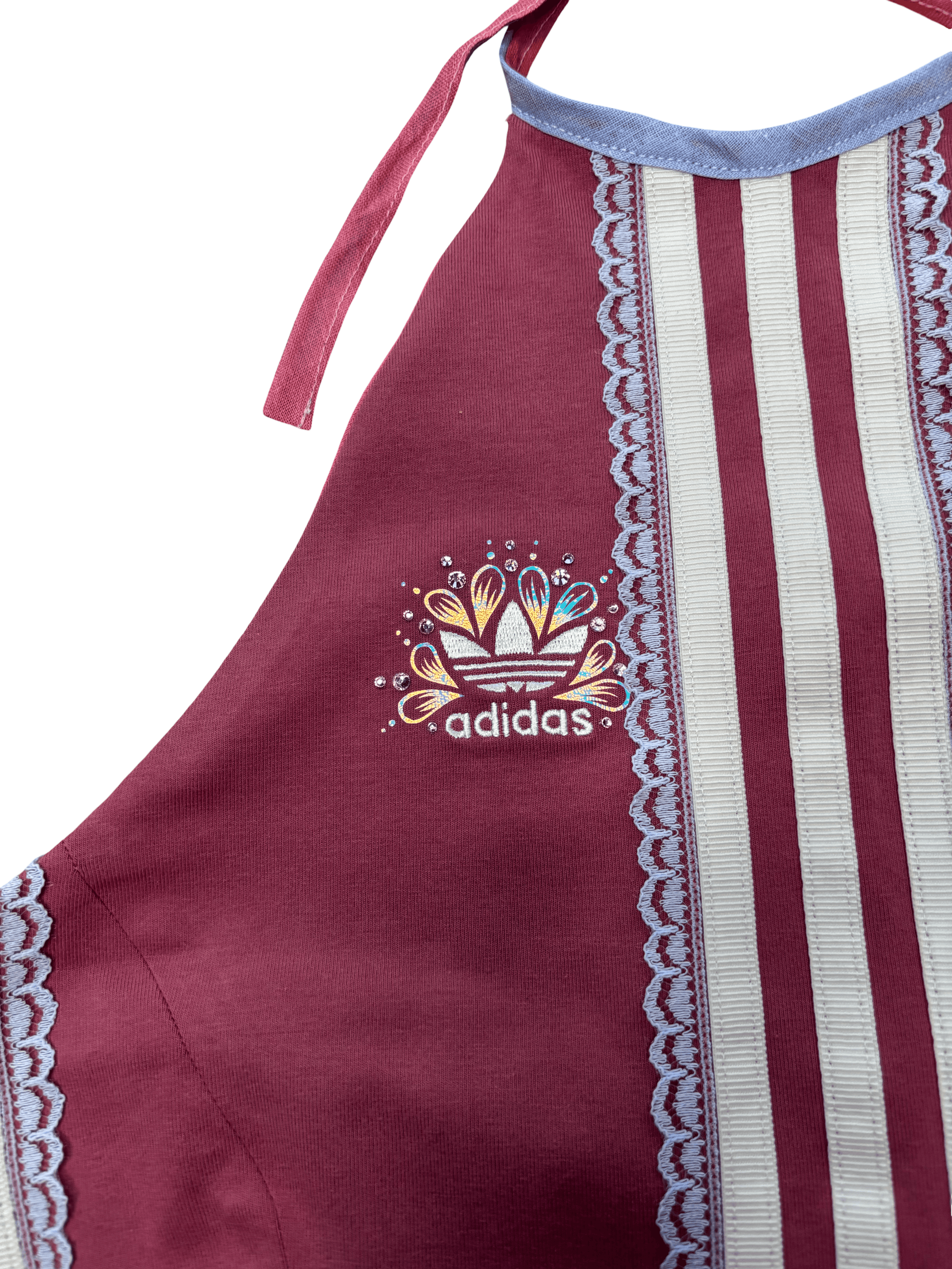 Deze korset top is gemaakt van een adidas legging, en daarmee klaar voor een nieuwe ronde. Afgewerkt met kant, handgesneden metallic foils en strass.