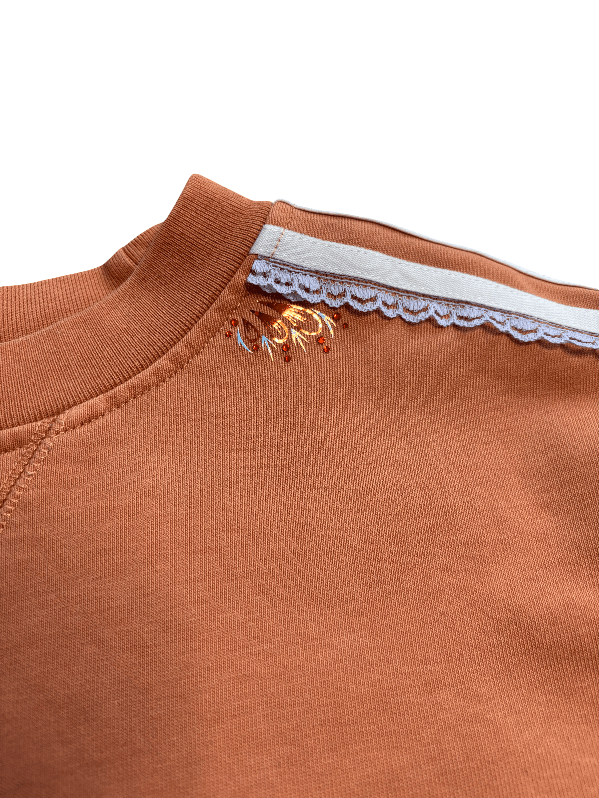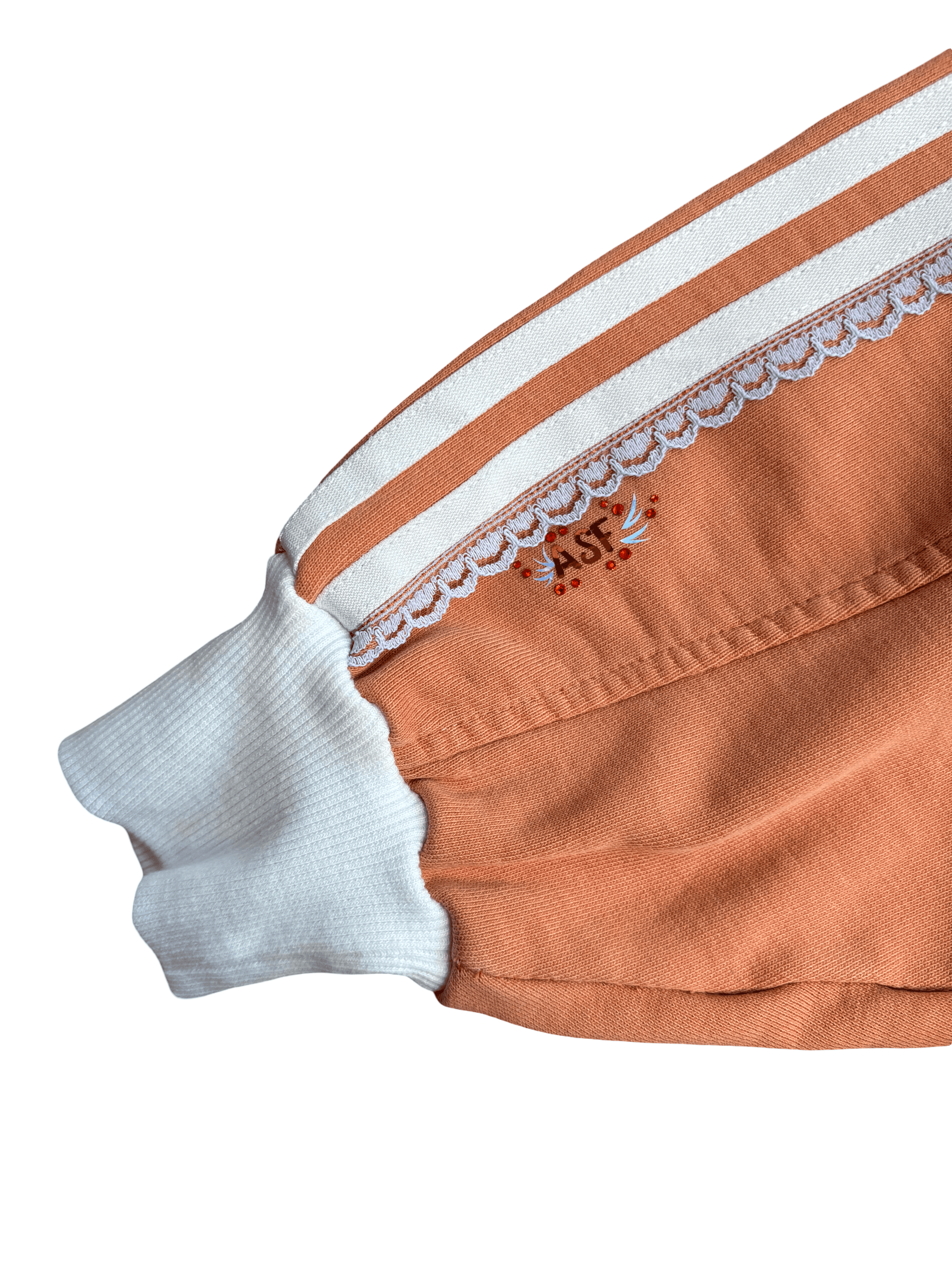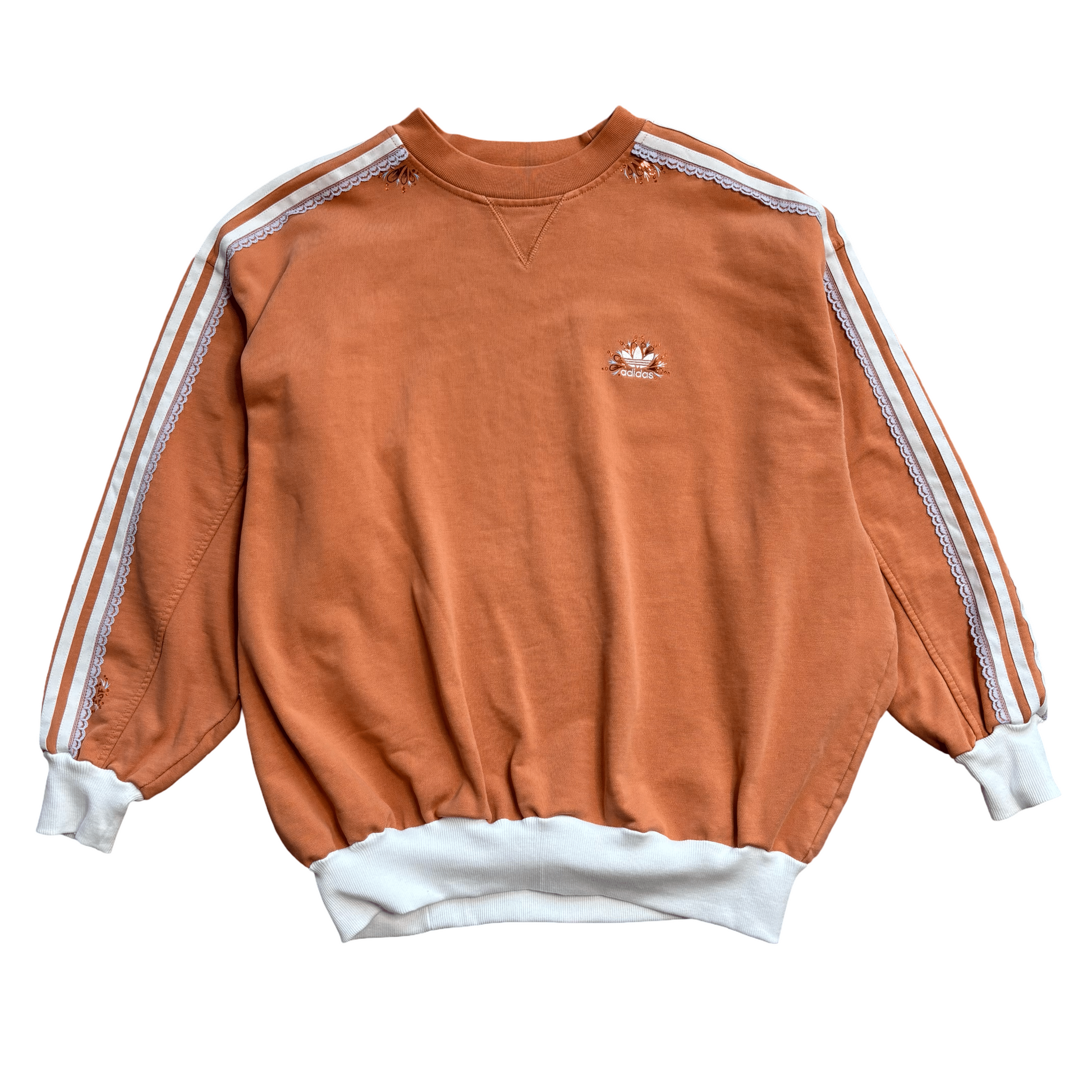 Deze tweedehands Adidas sweater is een nieuw leven in geblazen.Met de nieuwe boords heeft hij weer een frisse look gekregen. Afgemaakt met handgesneden metallic details,kant en een paar strassjes.